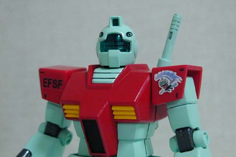 | 今回のジムのテーマはプリンタでシールをプリントして貼ること.ジムには特別なことはしていません.頭部のクリアーパーツと,足首のアーマーをあとはめ加工をした程度.頭部は中を黒く塗っておくとクリアパーツのムラが隠せます.